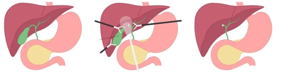 Karın içi organların değerlendirilmesinden sonra karın duvarına 3 küçük kesi daha yapılıp buradan girilen cerrahi aletlerle safra kesesi karaciğerden ve küçük bir kanalla bağlı olduğu ortak safra kanalından ayrılır. Daha sonra safra kesesinin kanalı ve safra kesesini besleyen damar titanyumdan yapılmış klip adı verilen zımbalar ile kapatılır. Böylece kolesistektomi tamamlanmış olur. İşlem bitip safra kesesi karın dışına alındıktan sonra kamera ile karın içi tekrar değerlendirilip içerdeki gaz boşaltılarak kesiler dikilir ve ameliyat sonlandırılır. Ameliyat sahasına kanama kontrolü yapıldıktan sonra içerde kan sıvı birikimini engelleyip dışarı almak içim ucunda sıvının toplanacağı ölçekli bir hazne bulunan dren adı verilen tüp yerleştirilmesi gerekebilir.